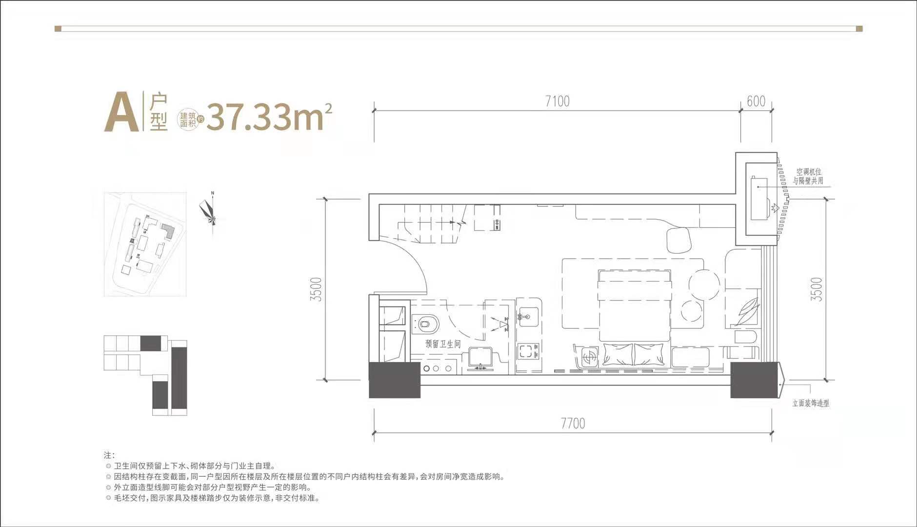 37.33平A户型深度解析:loft双钥匙公寓,可居住可办公,小面积有大想象。媒体策划、美甲美容、私人健身以及摄影录音等初创型商业选择我们项目是性价比最高的。百变空间,由你决定,一层办公,二层休闲亦是一个不错的选择。
